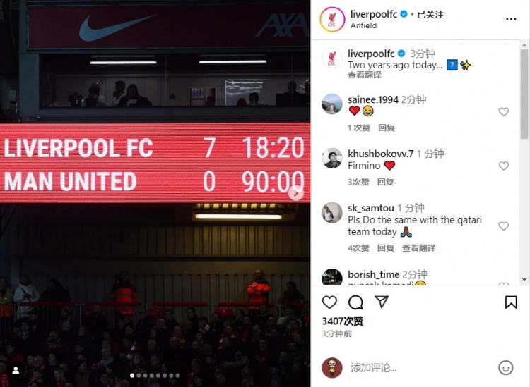 3月5日訊 今天是利物浦7-0曼聯(lián)兩周年紀(jì)念日,利物浦官方Instagram發(fā)文回顧。2023年3月5日,利物浦在英超聯(lián)賽中主場7-0大勝曼聯(lián),加克波、薩拉赫、努涅斯梅開二度,菲爾米諾破門。