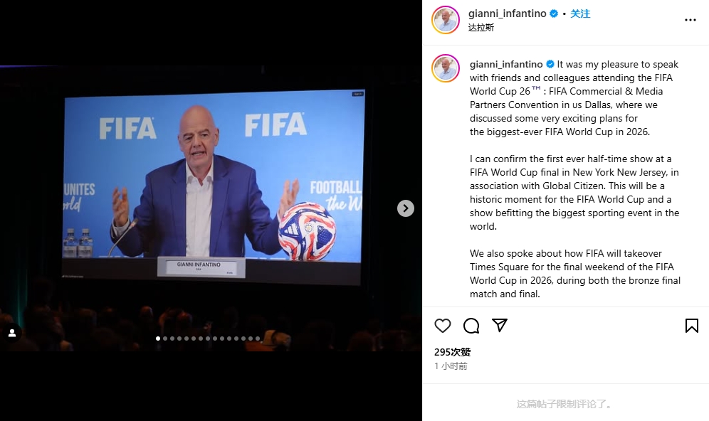變成超級碗?因凡蒂諾:26年世界杯決賽有中場表演,酷玩樂隊(duì)參與