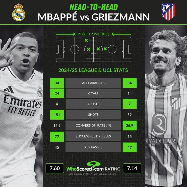 3月5日訊 歐冠十六強戰將上演馬德里同城德比,whoscored也對比了姆巴佩和格列茲曼本賽季的關鍵數據。本賽季聯賽+歐冠關鍵數據對比:姆巴佩(皇馬,26歲):34場,24球,4助攻,151射門,轉化