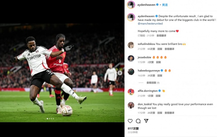 3月3日訊 曼聯(lián)在本輪足總杯點(diǎn)球大戰(zhàn)被富勒姆淘汰出局,小將海文在本場替補(bǔ)登場完成處子秀。他也在賽后通過社媒曬出自己的比賽照,并配文:“盡管結(jié)果并不理想,但我很高興能夠?yàn)檫@家世界最大俱樂部之一完成首秀。