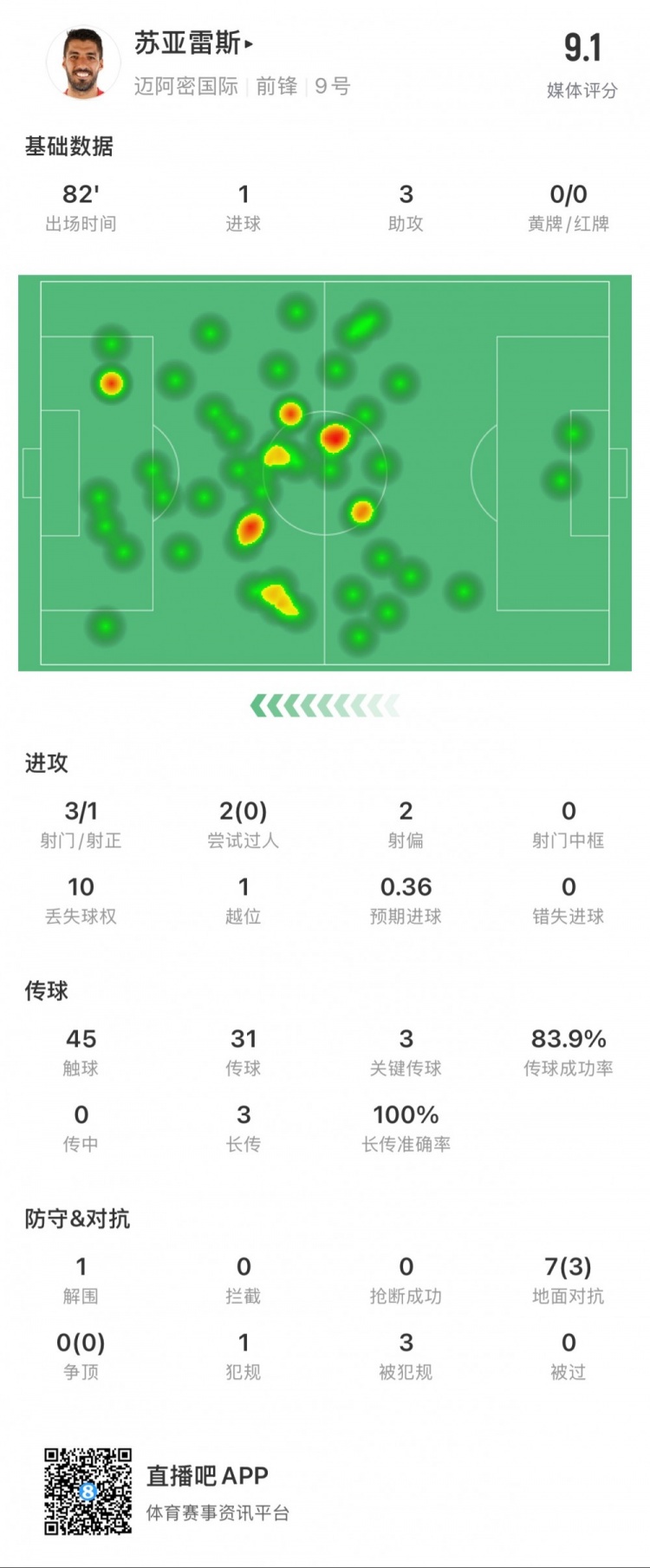 3月3日訊 美職聯常規(guī)賽,邁阿密國際對陣休斯頓迪納摩,蘇亞雷斯本場數據:1球3助3次射門1次射正2次過人成功0次10次丟失球權1次越位45次觸球3次關鍵傳球3次長傳均成功1次解圍3次被犯規(guī)7次對抗贏得
