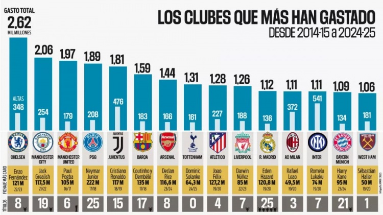 過去十年轉會投入榜:切爾西26億歐第一,英超BIG6&皇薩仁全上榜