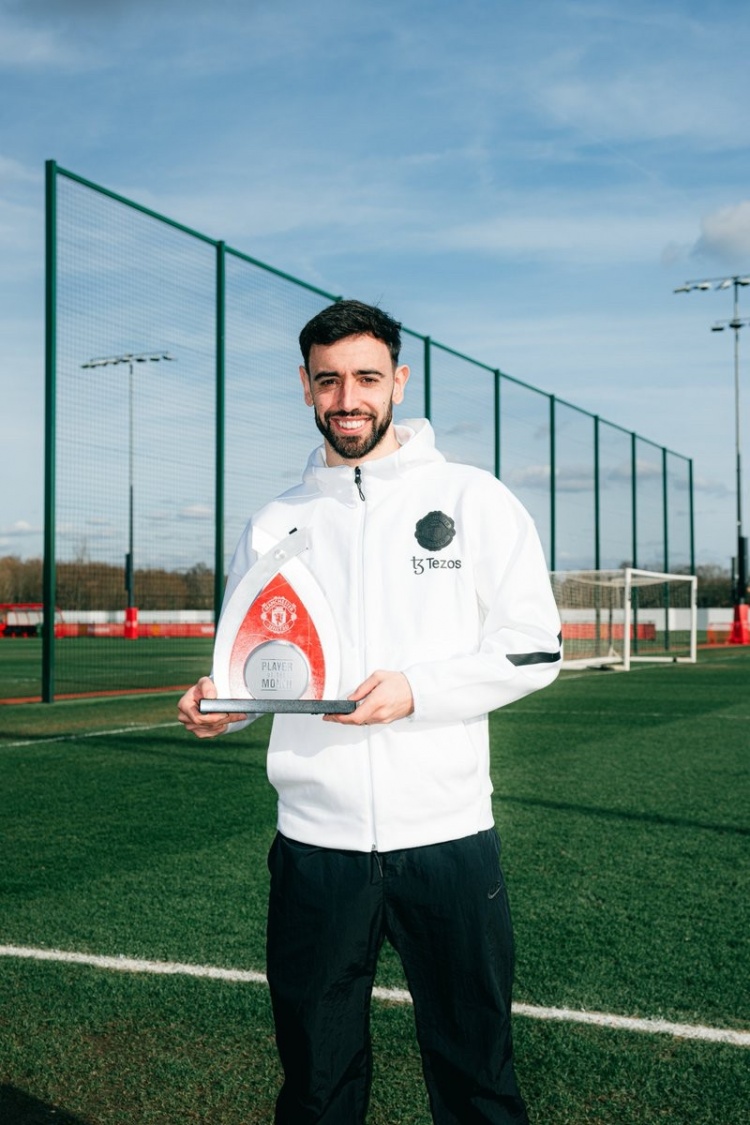 月最佳球員!曼聯曬B費領取獎杯照片:以最佳球員的身份進入三月