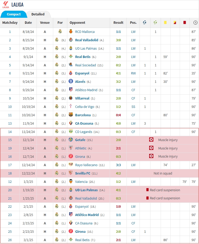 自去年11月底以來,3個月的時間里維尼修斯在西甲只取得了1個進球,另有1次助攻,同期卻拿到1紅2黃,傷缺錯過三場,停賽錯過兩場。