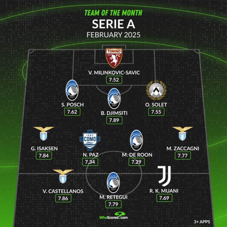whoscored意甲2月最佳陣:雷特吉領銜女神4將,穆阿尼&帕斯在列