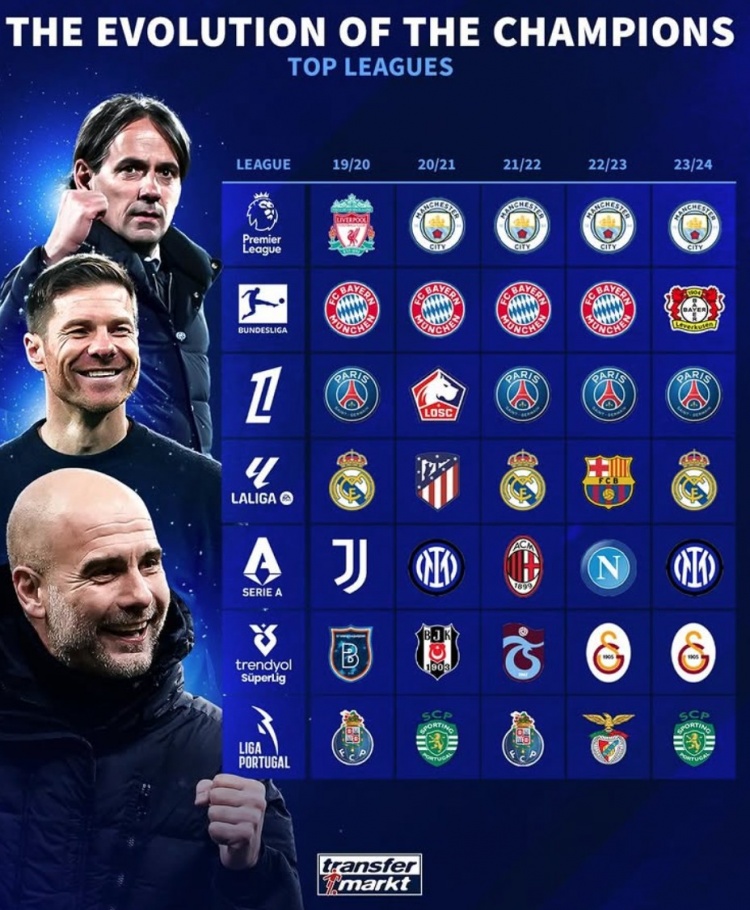 7大聯賽近5年冠軍:紅軍&藥廠&里爾虎口奪食,皇薩競&意甲4隊登頂