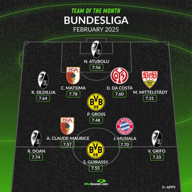 whoscored德甲2月最佳陣:穆西亞拉領(lǐng)銜,吉拉西&堂安律在列