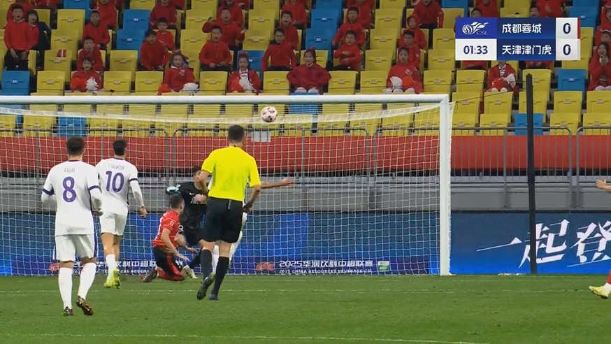 03月02日訊 中超第二輪,成都蓉城vs天津津門虎,比賽第25分鐘,胡荷韜精準傳中送助攻,韋世豪高難度頭球吊射破門,蓉城1-1扳平津門虎。