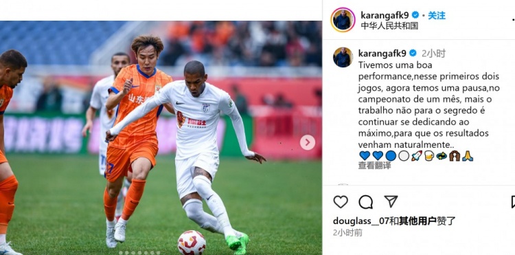 3月2日訊 本輪中超,大連英博1-4山東泰山,外援卡蘭加為大連英博打入一球。卡蘭加社媒寫道:我們在這兩場比賽表現不錯,現在我們迎來一個月的聯賽休賽期,但工作不會停止,秘訣是繼續全力以赴地投入,這樣好成