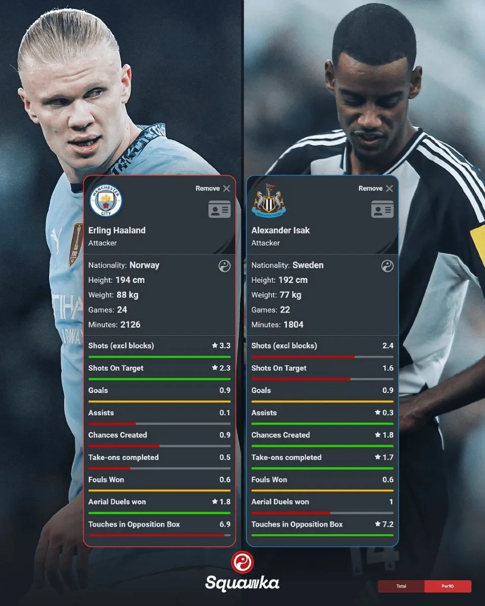 2月15日訊 本周英超第25輪,曼城主場對陣紐卡。Squawka對比了哈蘭德和伊薩克本賽季英超的數(shù)據(jù)。哈蘭德-伊薩克:場次:24-22進球:19-17助攻:2-5除去被封堵過的場均射門次數(shù):3.3-2