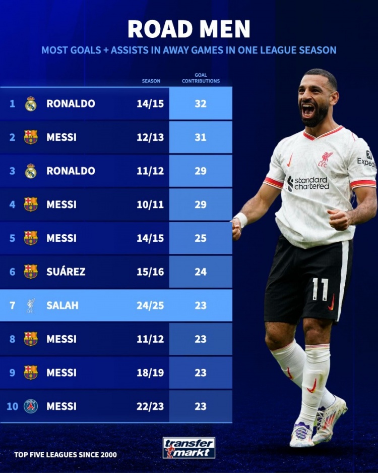 2月15日訊 德轉(zhuǎn)統(tǒng)計了2000年后在單賽季聯(lián)賽客場比賽中制造進球榜單,本賽季的薩拉赫已經(jīng)制造了23球,距離C羅保持的紀錄還差9球。2000年后單賽季聯(lián)賽客場制造進球榜:1,14/15賽季C羅:32球