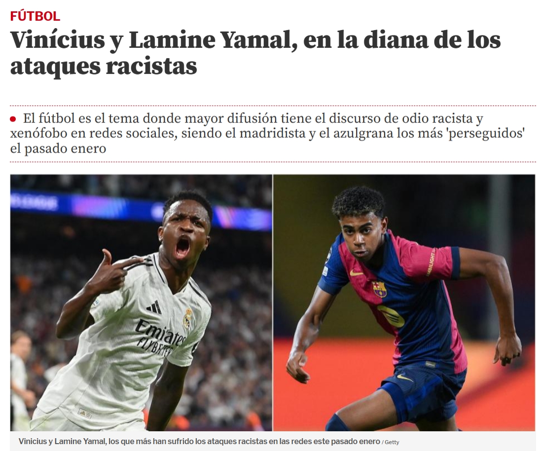 02月15日訊 西班牙媒體《世界體育報(bào)》消息,現(xiàn)在足球領(lǐng)域成西班牙網(wǎng)絡(luò)仇恨言論重災(zāi)區(qū),而皇馬的維尼修斯和巴薩的亞馬爾都是被種族攻擊的兩位靶心球員。根據(jù)西班牙相關(guān)當(dāng)局最新報(bào)告顯示,足球領(lǐng)域已成為西班牙社