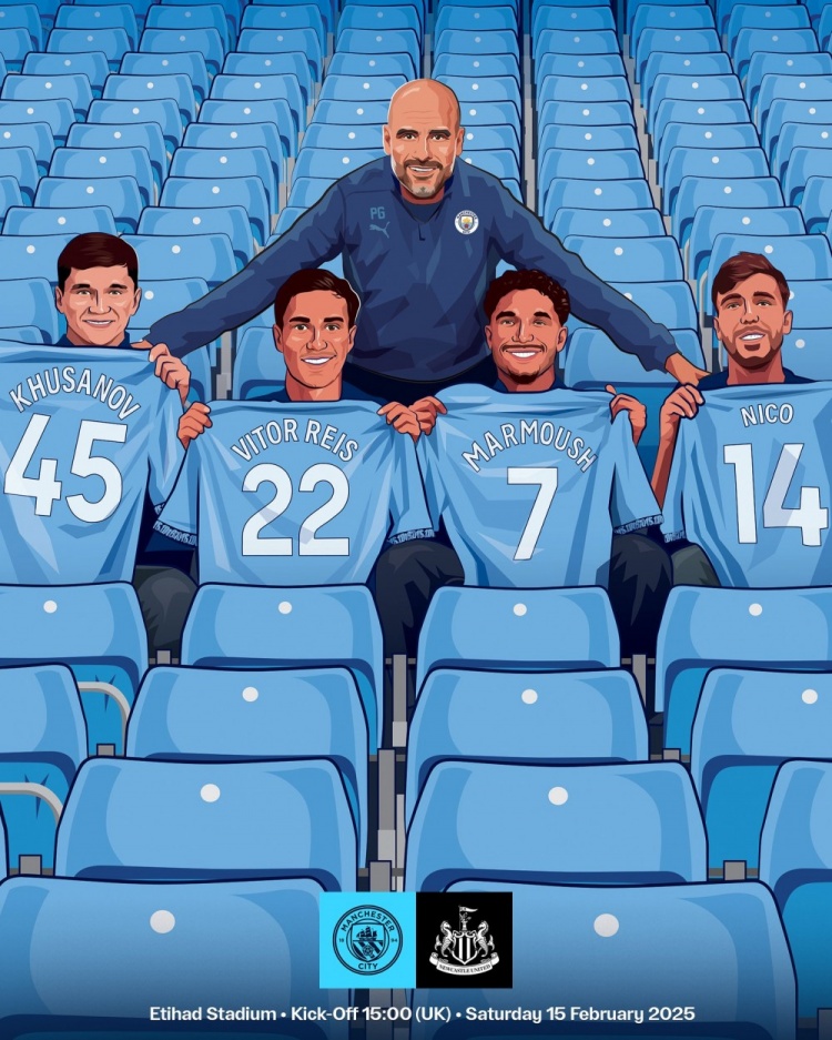 2月15日訊 北京時(shí)間今天晚上23點(diǎn),曼城將在英超第25輪比賽中主場(chǎng)對(duì)陣紐卡。曼城官方發(fā)布了為此役制作的海報(bào),主帥瓜迪奧拉帶領(lǐng)胡桑諾夫、雷斯、馬爾穆什、尼科-岡薩雷斯四位新援的漫畫形象出鏡。曼城英超近