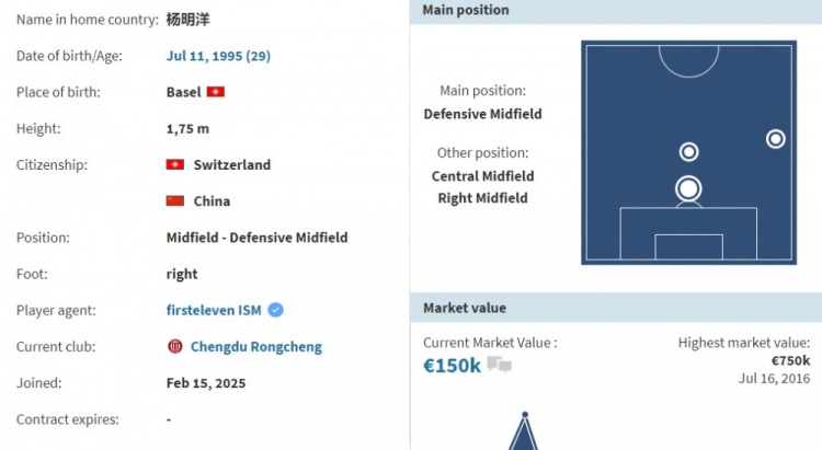 2月15日訊 《轉(zhuǎn)會(huì)市場(chǎng)》顯示,前南通支云球員楊明洋正式加盟成都蓉城,轉(zhuǎn)會(huì)費(fèi)為26.3萬歐元,約合人民幣200萬元。楊明洋,1995年7月11日出生于瑞士巴塞爾,2021年回歸中國籍,司職防守型中場(chǎng)。