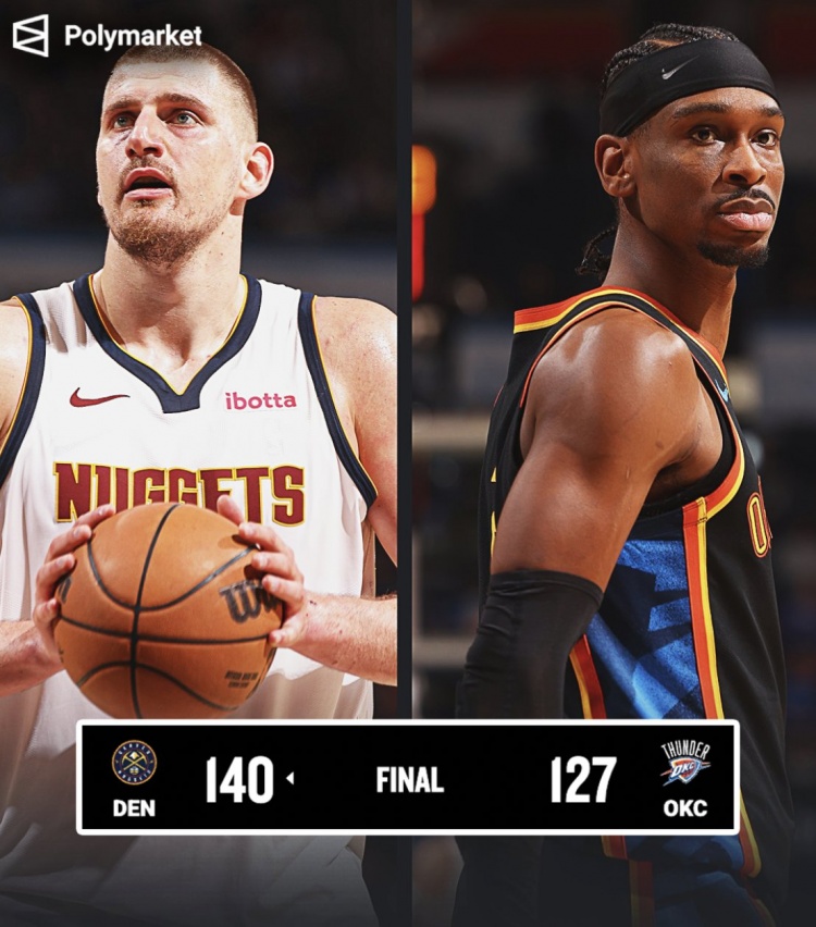 3月11日訊 NBA常規賽,掘金客場140-127擊敗雷霆,賽季戰成2-2平。賽后,美媒Polymarket更新了本賽季常規賽MVP概率,約基奇該數字為20%,亞歷山大則為78%。本場比賽,約基奇出戰