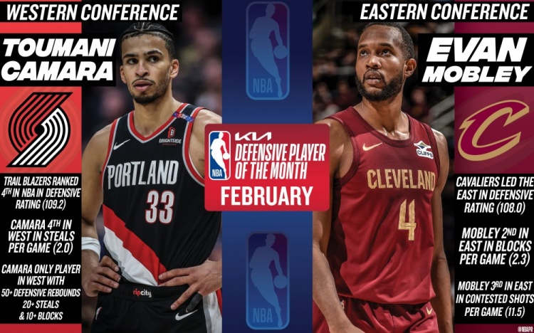 3月5日訊 今日NBA官方今日宣布,開拓者隊前鋒圖馬尼-卡馬拉和騎士中鋒小莫布里當(dāng)選2月份西部和東部最佳防守球員。本月開拓者的防守效率(109.2)全聯(lián)盟第四,卡馬拉的場均搶斷2.0次排西部第四,卡馬