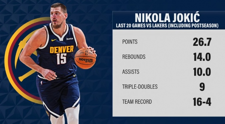 約基奇過去20場(chǎng)對(duì)陣湖人:場(chǎng)均26.7分14板10助&9次三雙 16勝4負(fù)?