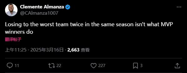 賽后,雷霆記者Clemente Almanza發推寫道:“同一個賽季兩次輸給聯盟最差的球隊,這可不是MVP該有的表現哦。”