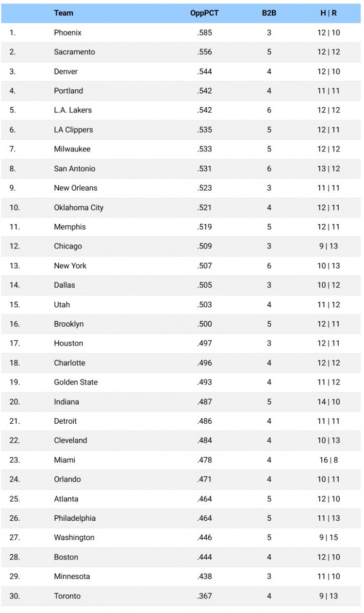 俄克拉荷馬雷霆:只有1場休息劣勢比賽,即3月4日主場對陣火箭。這是雷霆一段19場比賽中15場對陣目前勝率超過50%球隊的賽程開始,其中包括對陣火箭、灰熊、掘金、活塞和湖人各兩場比賽。此外,雷霆還有一場潛在的總決賽預演,即3月12日客場對陣凱爾特人。