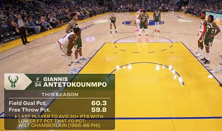 比賽中轉播方給出一組數據,字母哥本賽季投籃命中率60.3%,罰球命中率59.8%。