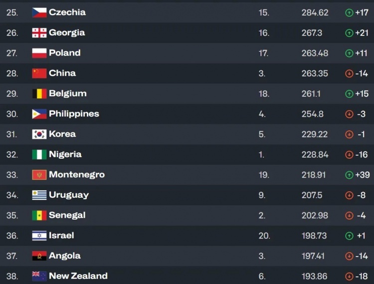 接著,你還要看看對手的世界排名,據此加上第三個項,公式為1.5*(世界排名平均數-對手排名),這蘊含著擊敗越強對手獲益越多、輸給越弱對手懲罰越重的理念。2023年狀態強勁的拉脫維亞,曾短期內連續掀翻西班牙、法國、希臘在內的多支排名高于自己的強隊,世界杯正賽上更是大勝巴西立陶宛喜提第五,藉此排名從29名暴漲到前八。