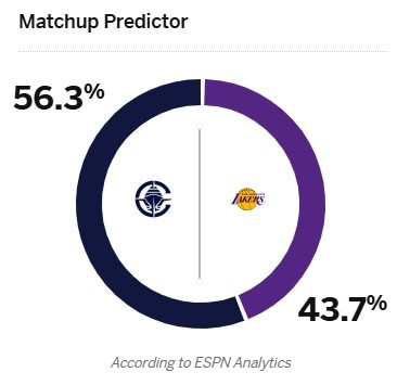 ESPN給出了本場比賽勝率預測,其中5連勝的湖人為43.7%,快船為56.3%。