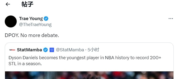 比賽結束后,老鷹球星特雷-楊轉發了丹尼爾斯的這一數據,并在旁邊寫道:“年度最佳防守球員。停止爭論。”