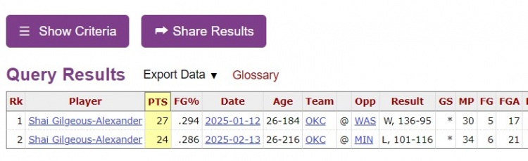 根據數據統計,亞歷山大今天的命中率(24.1%)是賽季至今的最低,本場比賽之前,SGA有過兩場命中率低于3成的比賽,一場是對陣奇才17中5(29.4%),一場是對陣森林狼21中6(28.6%)。
