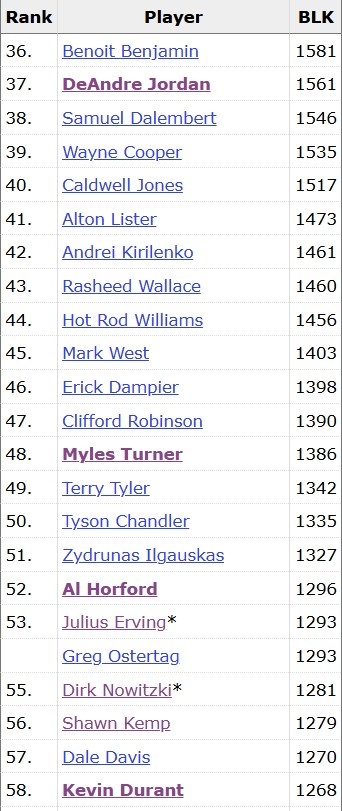 本場比賽過后,杜蘭特的常規(guī)賽生涯蓋帽總數(shù)來到1271次,超越戴爾-戴維斯,上升至NBA歷史第57位。
