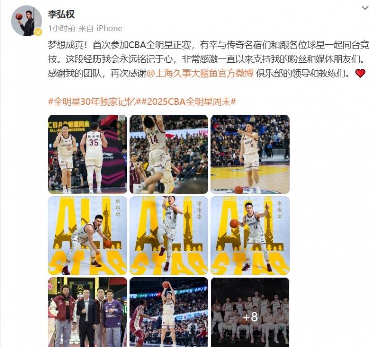李弘權配文:“夢想成真!首次參加CBA全明星正賽,有幸與傳奇名宿們和跟各位球星一起同臺競技。這段經歷我會永遠銘記于心,非常感激一直以來支持我的粉絲和媒體朋友們。感謝我的團隊,再次感謝上海久事大鯊魚俱樂部的領導和教練們。”