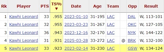 小卡今天以93.1%真實命中率砍下30+ 生涯152場30+中第4高效