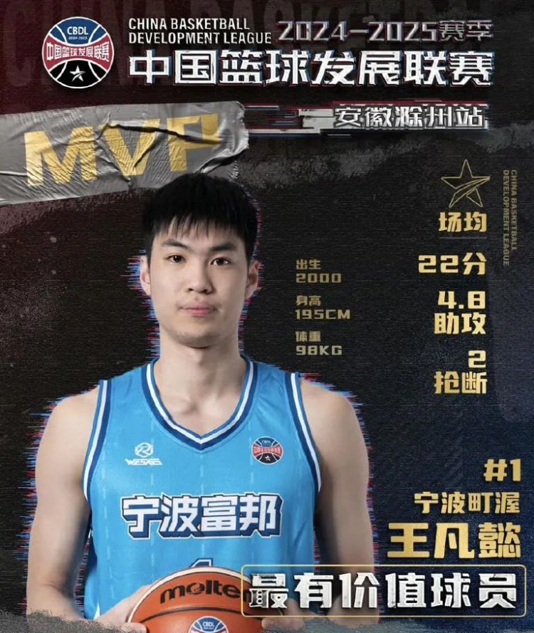 于是,王凡懿就只能去CBDL發光發熱了,不出意料的是,他在這里如魚得水……第二階段滁州站比賽,寧波在他的帶領下6戰全勝,王凡懿也以場均22分4.8助攻2搶斷收獲賽事MVP……