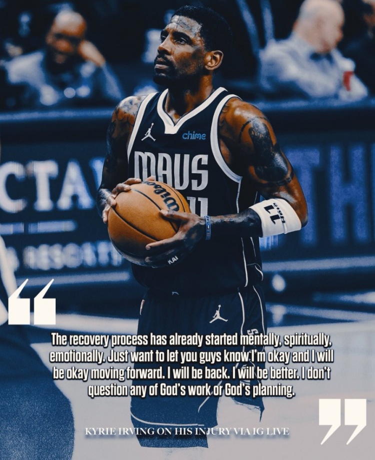 歐文在社交媒體上直播時說道:“我在心理上、情感上和精神上的恢復過程已經開始了。我想讓大家知道,我很好,我之后會好起來的。我會回來的。我會變得更好。我不會去質疑上帝的工作或者是計劃。”