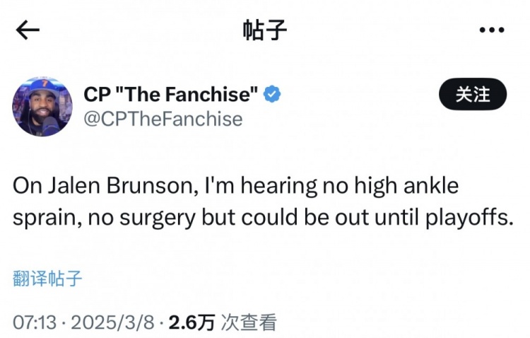 “關(guān)于杰倫-布倫森,我聽說不是高位腳踝扭傷,不需要手術(shù)治療,但他可能要缺席至季后賽開始前。”該博主寫道。