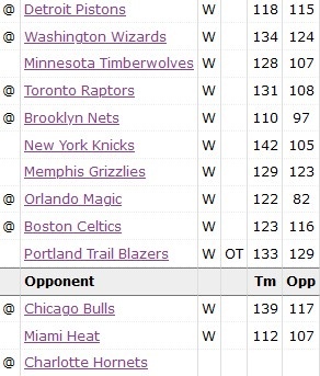 這13連勝期間,騎士得分都至少是110,他們也成為歷史第3支至少砍下13連勝且得分都在110+的球隊。