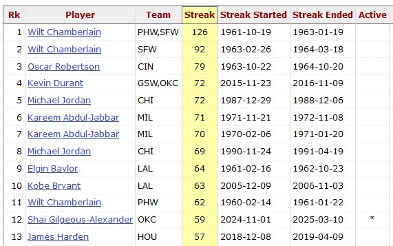 據統計,這是亞歷山大連續第60場比賽砍下20+,他也成為NBA歷史上第8個做到這點的球員。另外7人分別為:張伯倫、奧斯卡-羅伯特森、杜蘭特、喬丹、賈巴爾、埃爾金-貝勒、科比。
