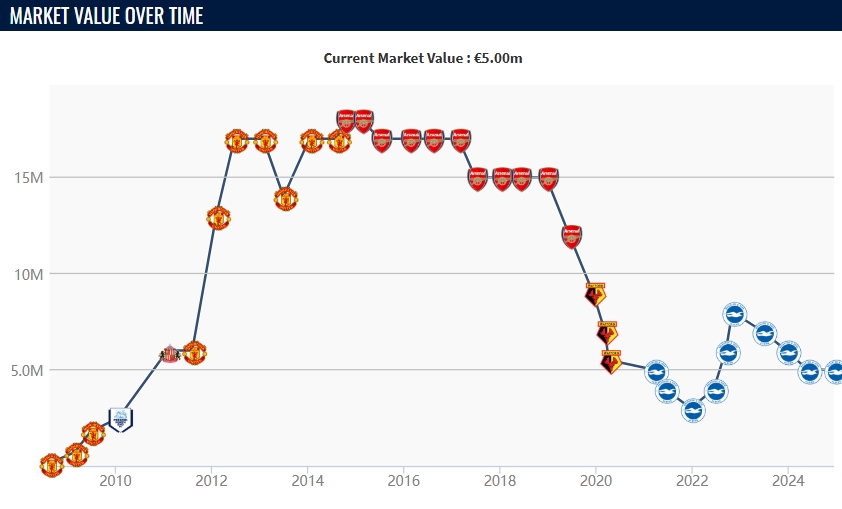 維爾貝克現年34歲,出自曼聯青訓,球員在2014年以2000萬歐元轉會費轉投阿森納。維爾貝克在2019年自由身轉會至沃特福德后,布萊頓于2020年10月將其簽下,并效力至今。本賽季這位英格蘭前鋒代表球隊英超出場19次,打進6球并有4次助攻。目前球員德轉身價為500萬歐元。