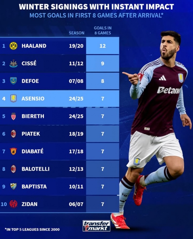 3月15日訊 阿森西奧在冬窗加盟維拉后表現(xiàn)搶眼,各項(xiàng)賽事8場(chǎng)打進(jìn)7球,數(shù)據(jù)統(tǒng)計(jì)顯示這也并列五大聯(lián)賽新世紀(jì)冬窗新援同期進(jìn)球榜第4位。