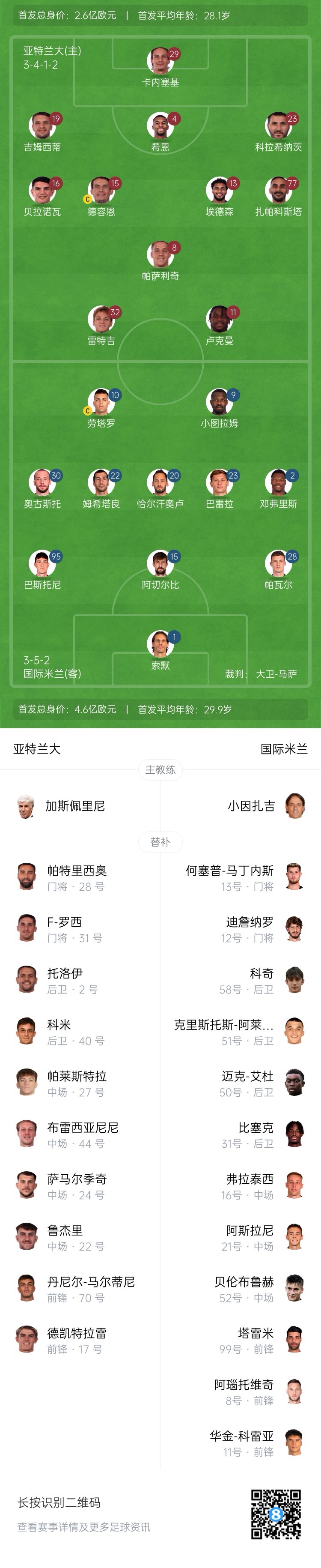 3月17日訊 意甲第29輪焦點戰,藍黑對決!亞特蘭大主場迎戰國米比賽即將打響。賽前首發出爐。
