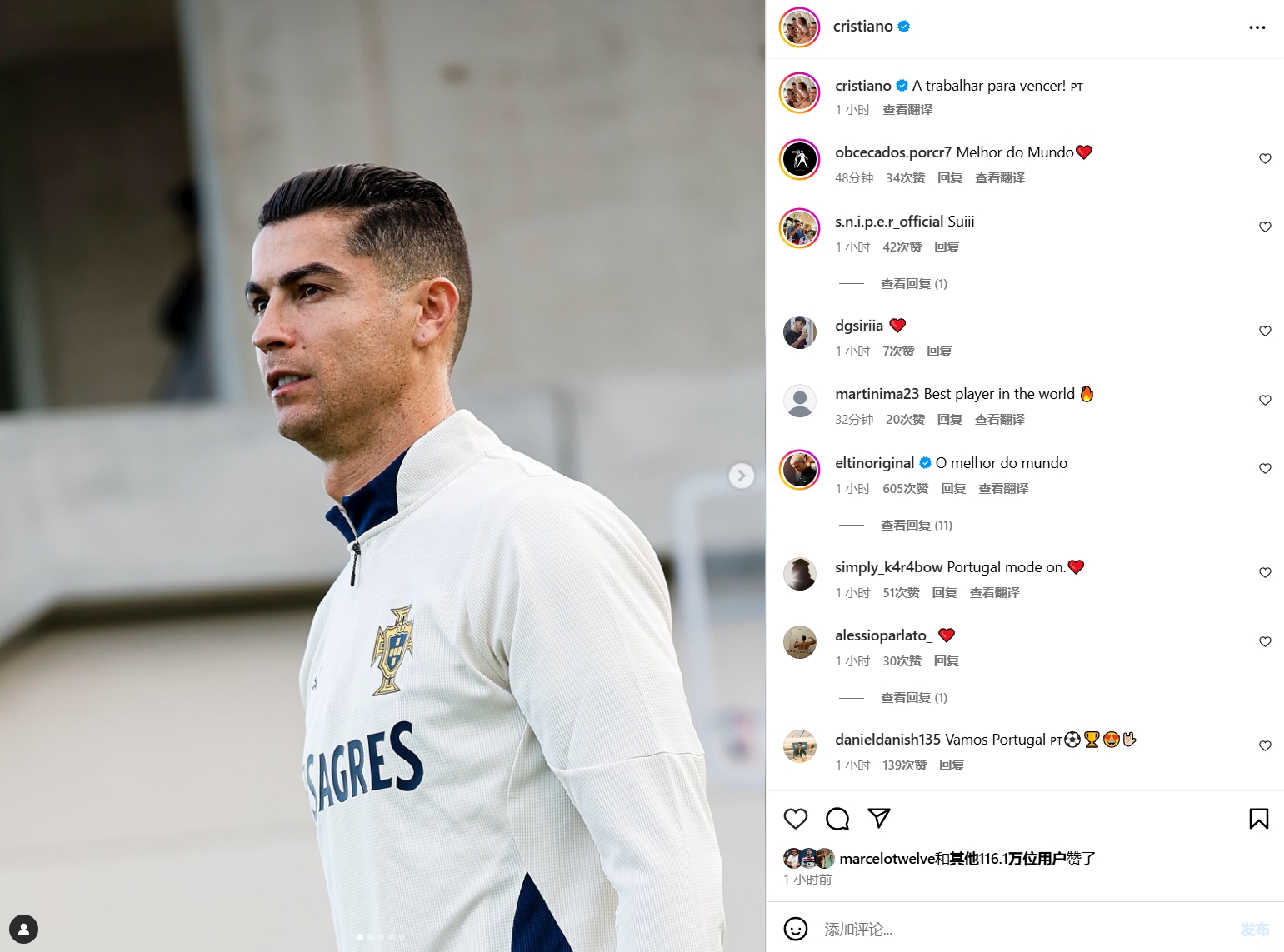 3月19日訊 不久前,正在葡萄牙國家隊備戰的C羅更新了社交媒體。