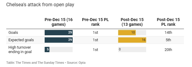 另外,切爾西在英超前16輪中利用高位失誤打進了5粒進球排名第一,而最近13輪比賽該項數據為0。