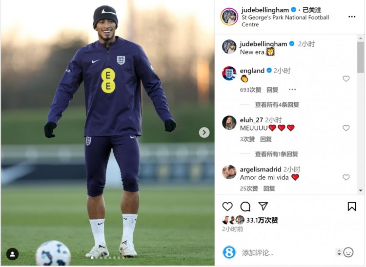 貝林厄姆隨英格蘭隊備戰(zhàn)世預(yù)賽,他在社交媒體上曬出訓練照片,并配文:“新時代????