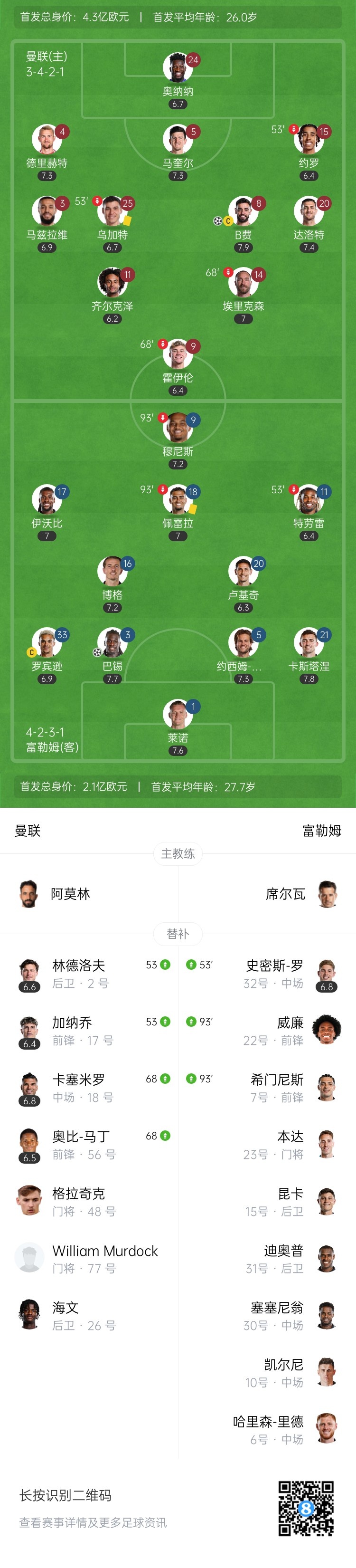 常規時間結束,曼聯1-1富勒姆,比賽進入加時。