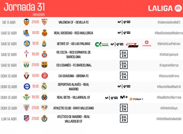 3月20日訊 西甲官方公布了第31輪比賽的開球時間,萊加內斯vs巴薩4月13日3點開球,阿拉維斯vs皇馬4月13日22點15分開球。