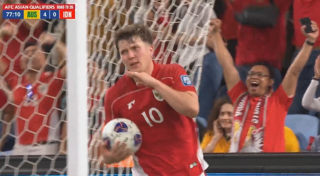 03月20日訊 世預賽亞洲區第三階段C組第7輪,澳大利亞vs印尼,比賽第78分鐘,澳大利亞后防失誤,印尼歸化前鋒羅梅尼進球,打入印尼國家隊生涯處子球,并做“割喉”慶祝,印尼仍1-4落后,克魯伊維特場邊不停鼓掌。