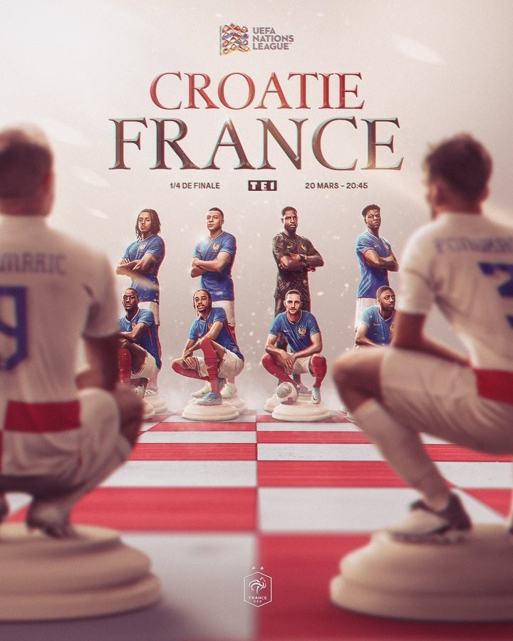 3月20日訊 北京時間3月21日星期五凌晨3點45分,法國將在歐國聯1/4賽決賽首回合客場挑戰(zhàn)克羅地亞,法國隊官方今天曬出了海報,為比賽預熱。