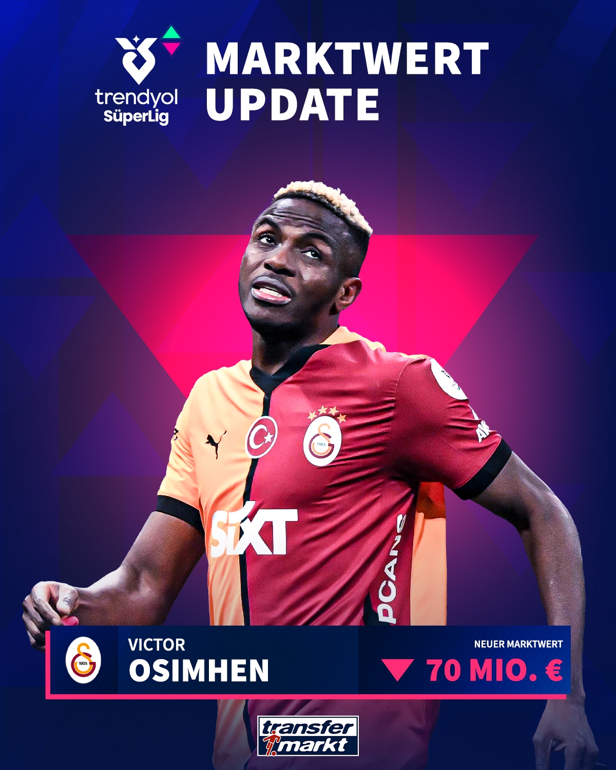 03月20日訊 德轉(zhuǎn)今日更新了土超球員身價,本賽季租借至加拉塔薩雷的奧斯梅恩身價再次下跌500萬歐,目前身價7000萬歐。