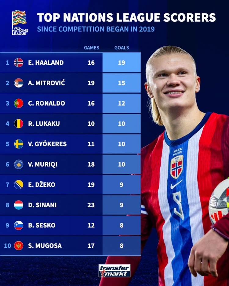 3月21日訊 歐國聯賽事戰火重燃,《轉會市場》也統計了歐國聯歷史射手榜,哈蘭德居首。