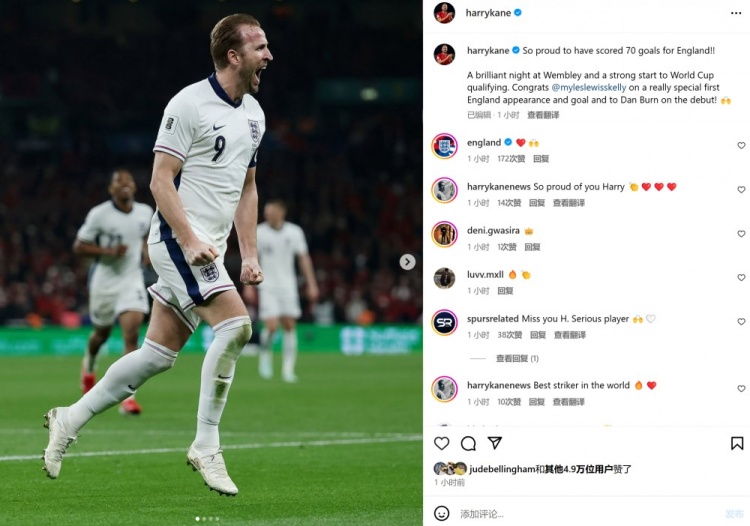 凱恩社媒曬照:自豪打進在英格蘭的第70球,祝賀斯凱利首秀破門?