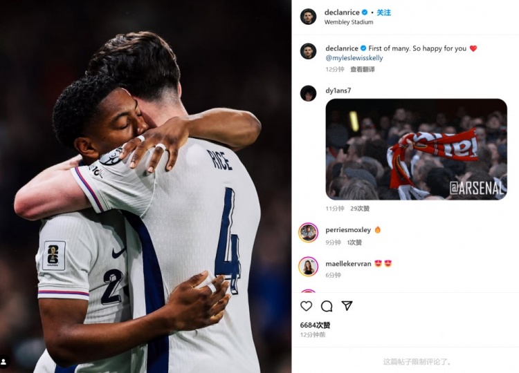 作為雙料隊友的老大哥賴斯也在賽后通過社媒曬出兩人的擁抱照,并配文:“未來眾多進(jìn)球里的第一個!我為你感到非常開心??@斯凱利”。